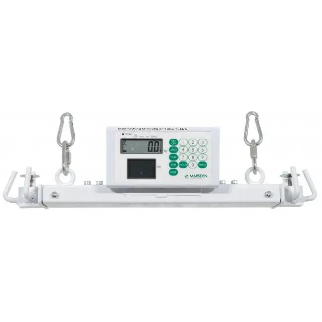 This new, lighter Class III Approved hoist weigher attachment fits most types of hoists that have the coathanger type of sling support. The hooks are approximately 39 cms. apart. Simple to operate - lift the patient and weigh. Body Mass Index function. Safety clips to secure sling straps. Hold of weight feature. Weight of scale 6 Kg. Powered by batteries or supplied mains adaptor. Capacity 200 Kg.