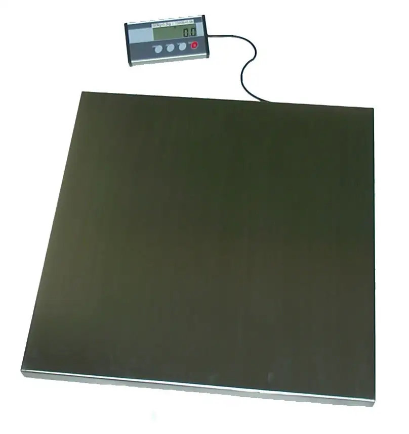 Lightweight low-profile stainless steel platform digital scales suitable for general purpose industrial weighing applications. Powered by batteries or supplied mains adaptor. Indicator unit connected to base by 2 metres of cable. Platform height only 70 mm. Capacity 300 Kg / 660 Lb.